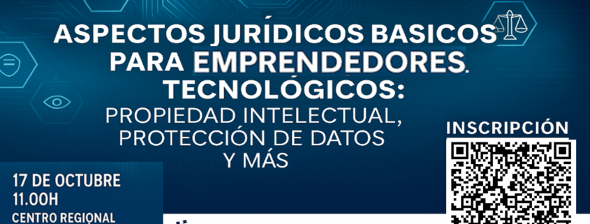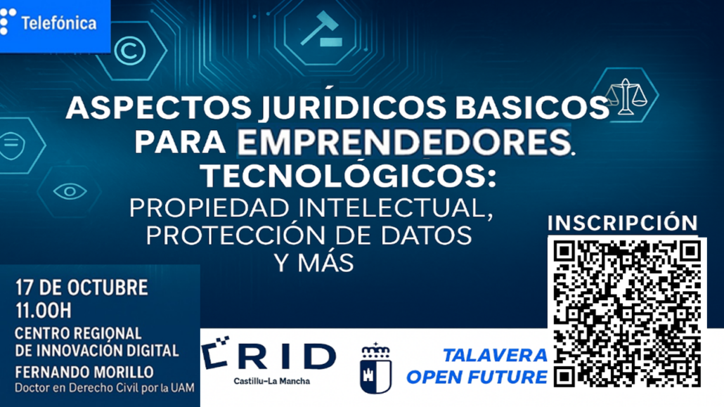 Desde el Centro Regional de Innovación Digital (CRID) tenemos el placer de invitarles a la charla “Aspectos Jurídicos Básicos para Emprendedores Tecnológicos: Propiedad Intelectual, Protección de Datos y Más”, organizada por Telefónica, que se celebrará el próximo 17 de octubre a las 11:00 h en nuestras instalaciones.